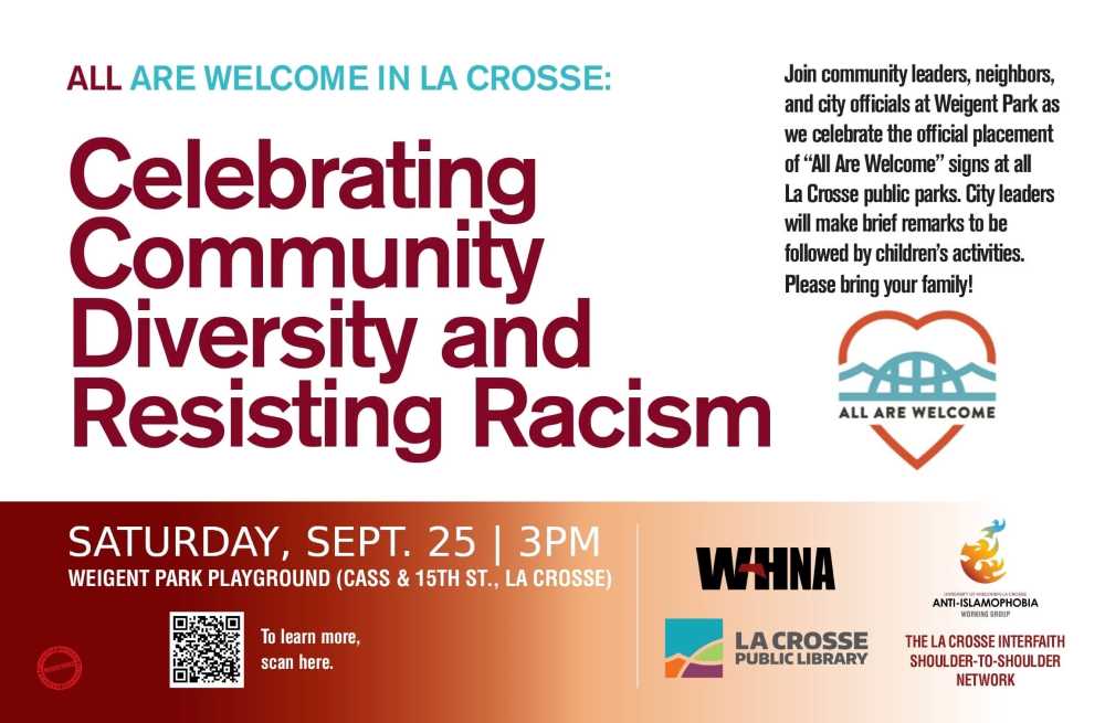 La Crosse, Wis. — Organizers of La Crosse’s Hate Has No Home Here campaign will gather at Weigent Park Saturday, Sept. 25, to celebrate the installation of “All Are Welcome” signage at public parks throughout the city.