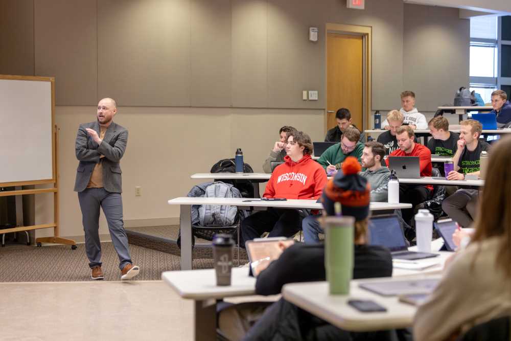 Shane Murphy, UWL assistant professor of health professions, lectures on artificial intelligence (AI) ethics during a physical therapy class.