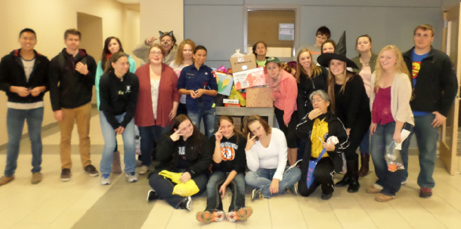 Students in the UWL 100 Freshman Seminar class of Cecilia Manrique, Carla Burkhardt and Megan Lindbeck trick or treated for food items for the campus food pantry Oct. 29. Pictured, from left, front: Rachel Spencer, Michela Campbell, Cora Heinrichs and Cecilia Manrique. Standing left of cart: Gary Vang, Drew Stremer, Haley Lehr, Ashley Langeslag , Megan Lindbeck, Carla Burkhardt, Lauren Feirer and Danielle Ortiz. Right of cart: Carissa McClain, Jessa Lounsbrough, Jenna Turner, Mackenzie Kutchera, Maya Schulte, Elizabeth Bakken. and Spencer Susa. Back group: Kaia Hongerholt, Andrew Mann, and Blaire Thielen[/caption]