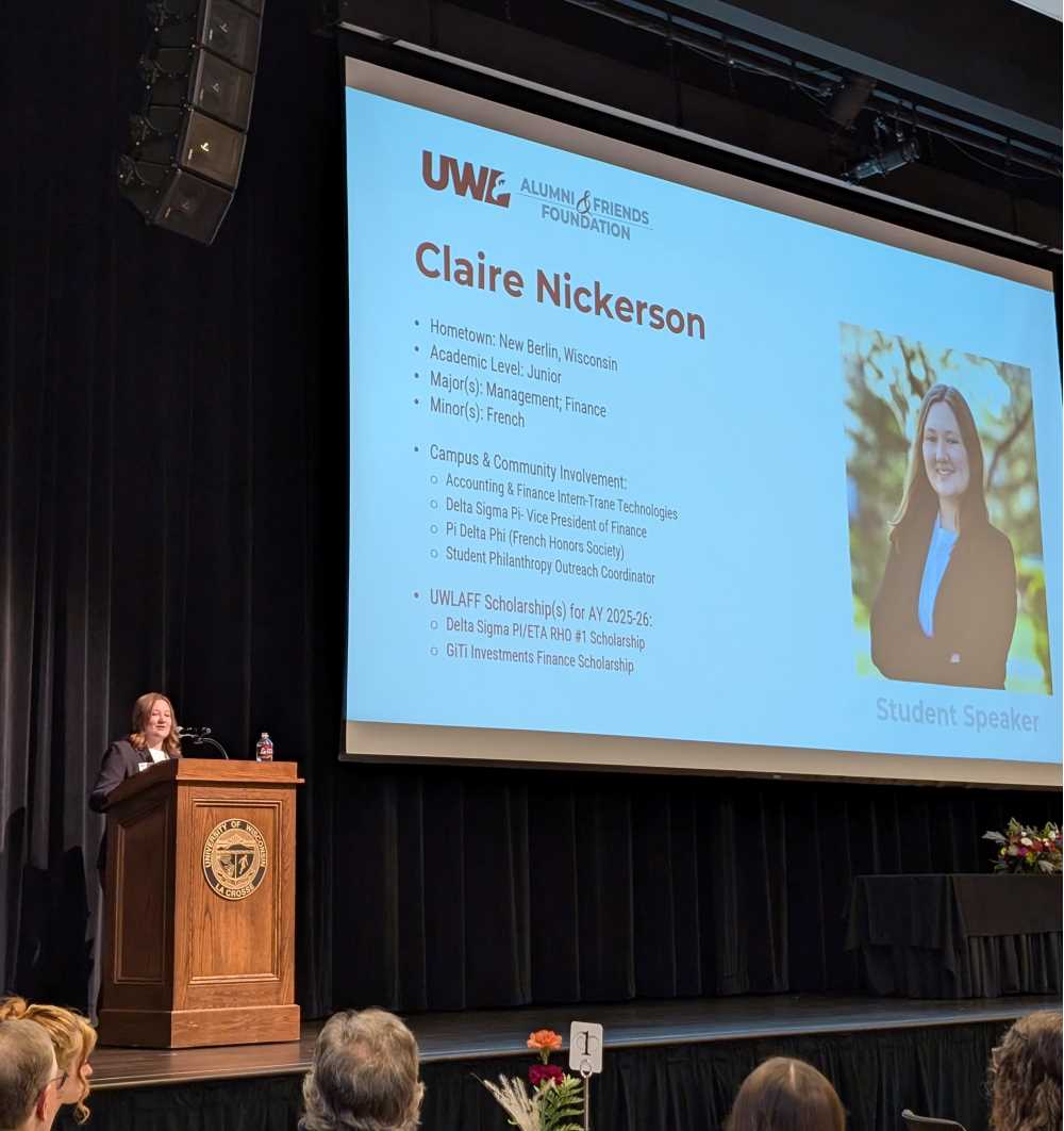 “Receiving UWL Foundation scholarships has given me the freedom to focus on gaining new experiences rather than financial stress,” says Claire Nickerson, one of the evening’s student speakers. “Because of these opportunities, I am able to hold an internship and leadership roles that will help me build skills and knowledge that I will use long after graduation.”
