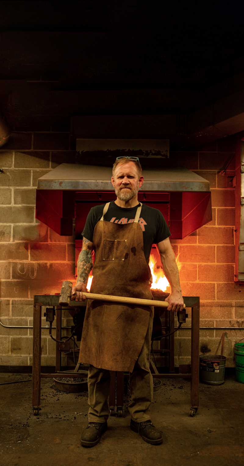 Favorite class to teach: Art 223 (Introduction to Blacksmithing) because it’s a very unique course to have in a university setting. It’s a physically demanding course that allows students to investigate this ancient process as an avenue of creative expression. Students are usually a bit hesitant at the beginning of the semester because fire, sparks and glowing iron can be scary. However, students conquer that initial fear quickly, and my enjoyment comes from witnessing their confidence build. Once a student realizes the potential a rigid material like steel possesses to create objects, tools and works of art, the sky’s the limit.