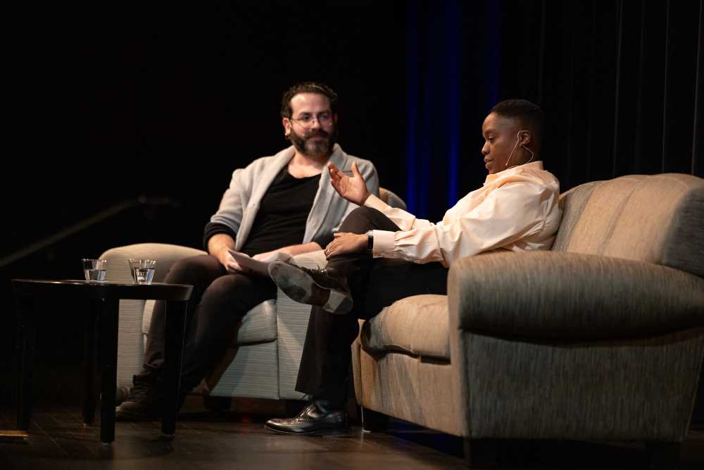 Nicole Miller, university police sergeant, (right) discusses her experiences as part of a panel discussion marking Black History Month. Richard Breaux, associate professor of race, gender and sexuality studies, was the other keynote speaker.