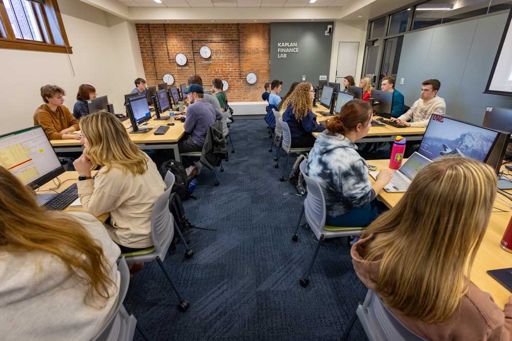 Students at work in the Kaplan Finance Lab in Wittich Hall. The lab — created through support by alumnus Andy Temte and Kaplan Professional in La Crosse — allows students to access state-of-the-art technology and up-to-the-minute stock market information.