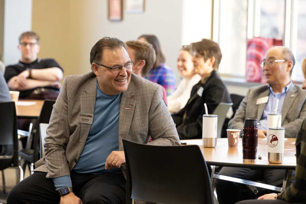 Interim Provost Karl Kunkel shares a laugh during the Eagles at Work event, recognizing staff and faculty who supported the UWL Alumni & Friends Foundation in the past year.