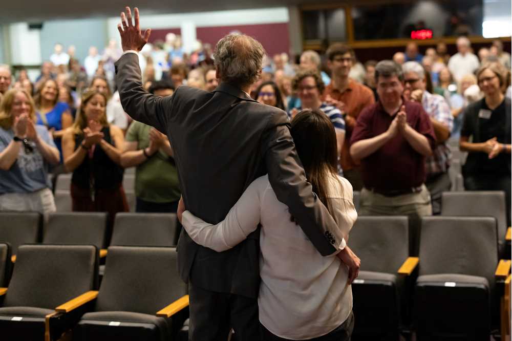 Gow and his wife, Carmen Wilson, wave to the crowd in Graff Main Hall's Hesprich Auditorium.