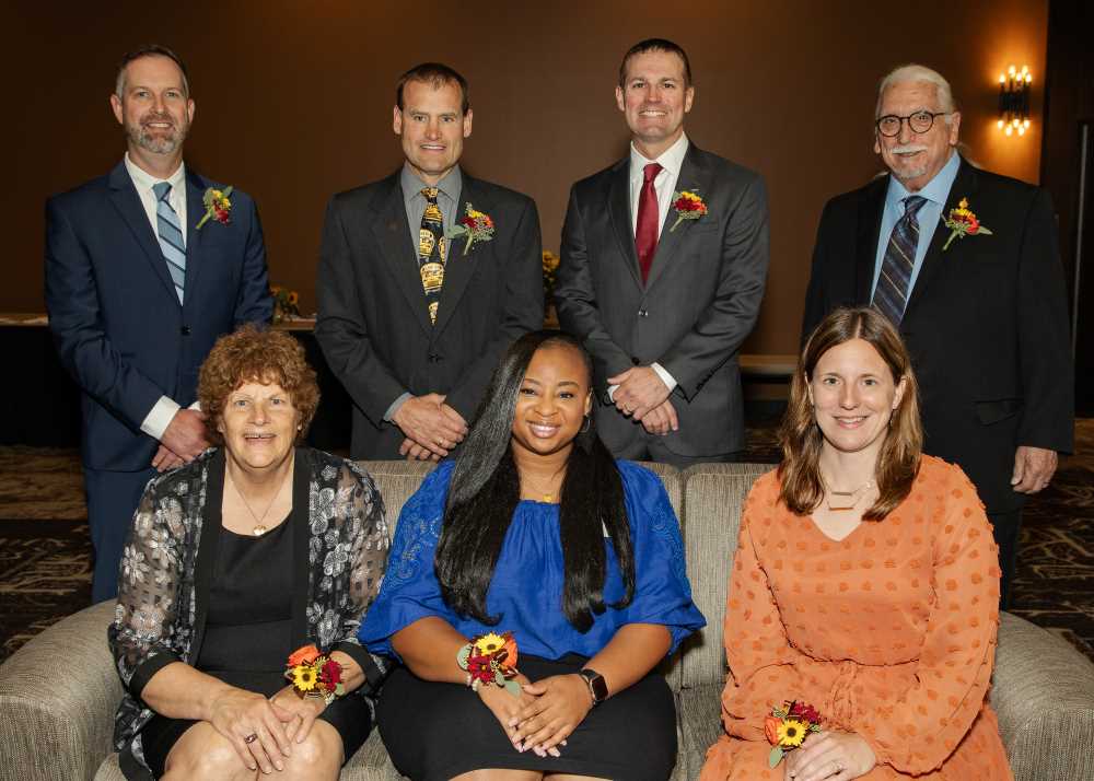 This year's Distinguished Alumni Award recipients returned to campus for a celebration Sept. 22 and 23. From left to right and back to front: Isaac Hoffman, Mark Gruen, Bill Bosch, Neil Duresky, Kris Fritz, Jazzma Holland and Colleen McDowell.