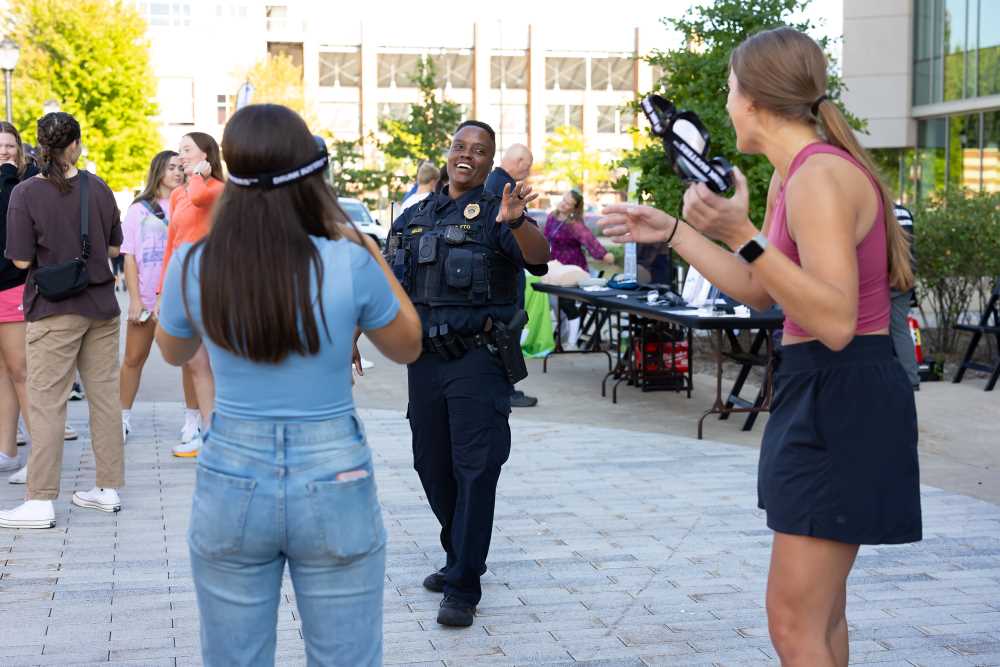 Police Sergeant Nicole Miller shares a laugh with students at Eagle Fest.