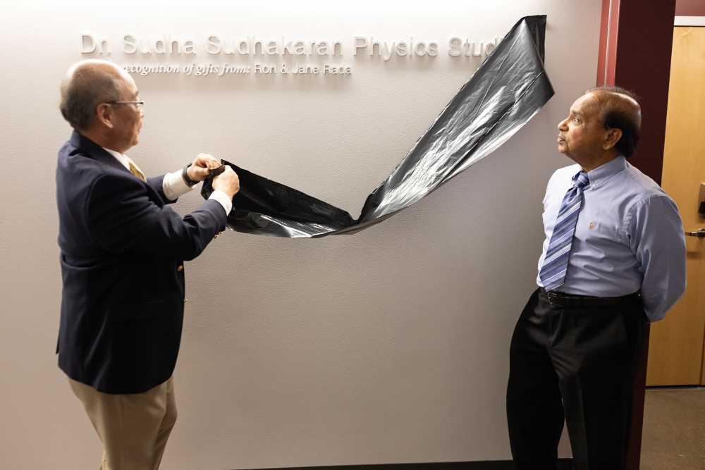 Sudhakaran (right) watches as College of Science & Health Dean Ju Kim unveils the signage outside the physics laboratory. Sudhakaran recently retired after a long and distinguished career at UWL.