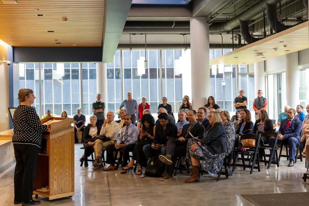 The campus community gathered Sept. 15 to celebrate the dedication of the Dr. Sudha Sudhakaran Physics Laboratory in the Prairie Springs Science Center. The dedication was made possible through gifts from Ron and Jane Rada, who wanted to honor the longtime professor of physics.