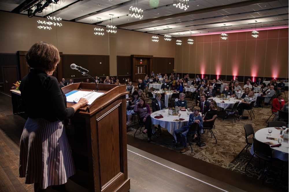 Celebrating the Distinguished Alumni Award recipients in the Bluffs ballroom in the Student Union.