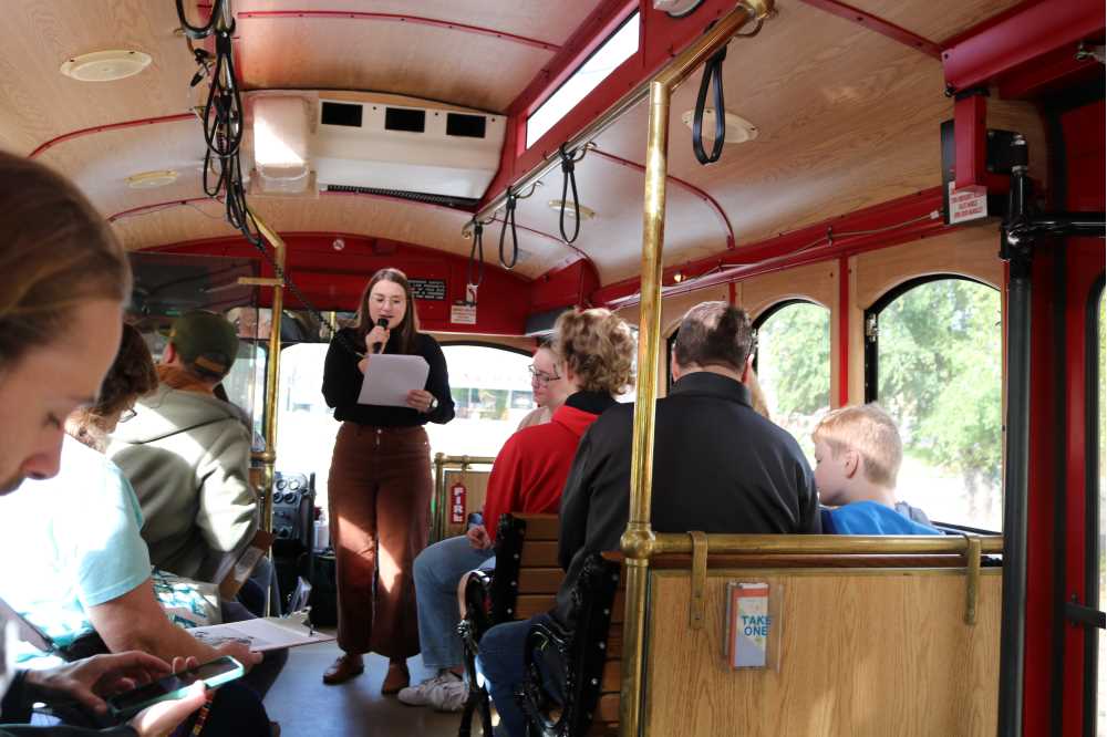 Tourgoers pack a trolley for tours of La Crosse's Northside in October as the Hear, Here Northside project was launched. Five tours were offered showcasing stories from different facets of Northside history. Here Sara Kruger, a tour guide, shares information on the Mid-Century Memories tour Oct. 6. Photo courtesy of Explore La Crosse.