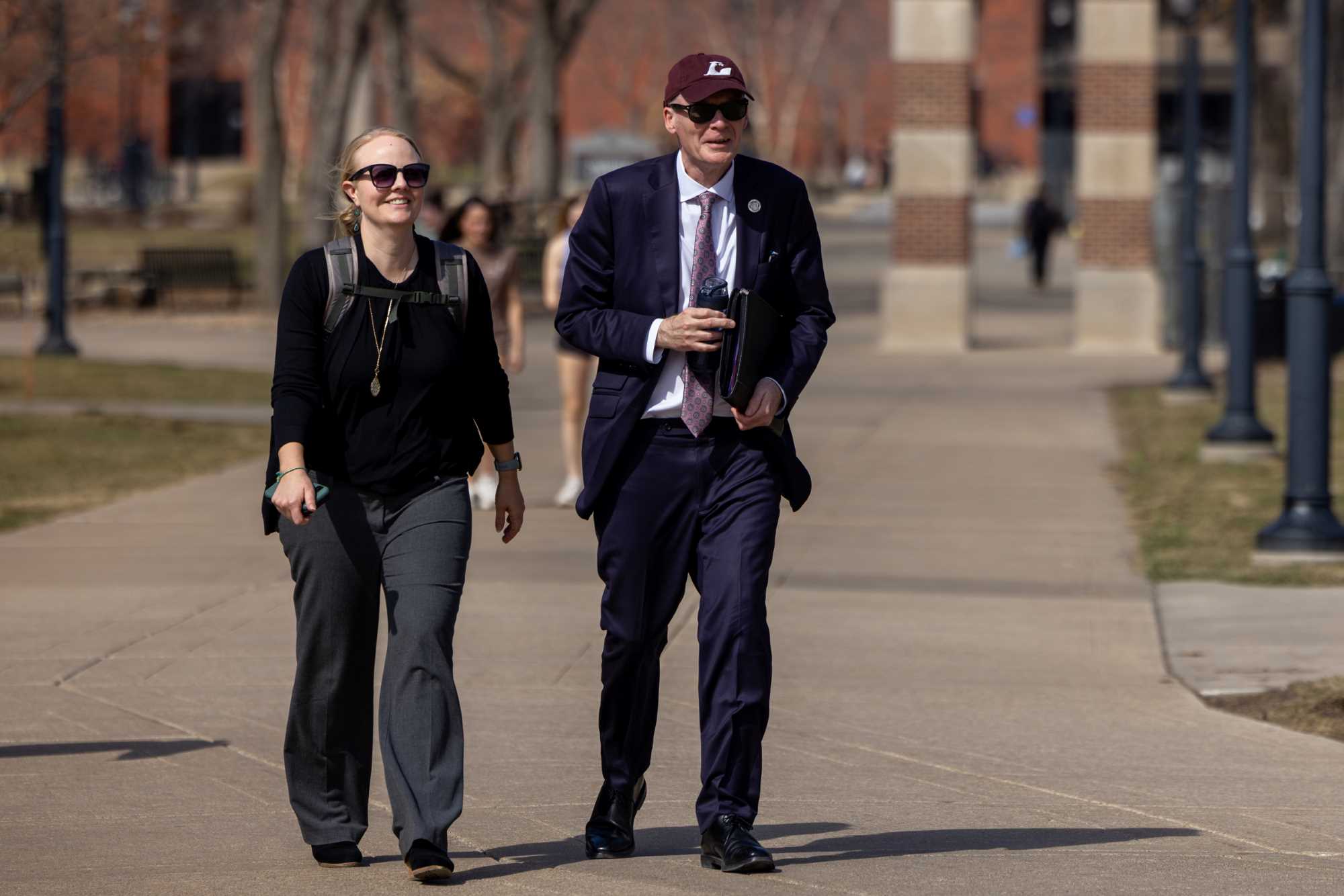 Chief of Staff Stacy Twite and Chancellor James Beeby enjoy a stroll in the sunshine between meetings.