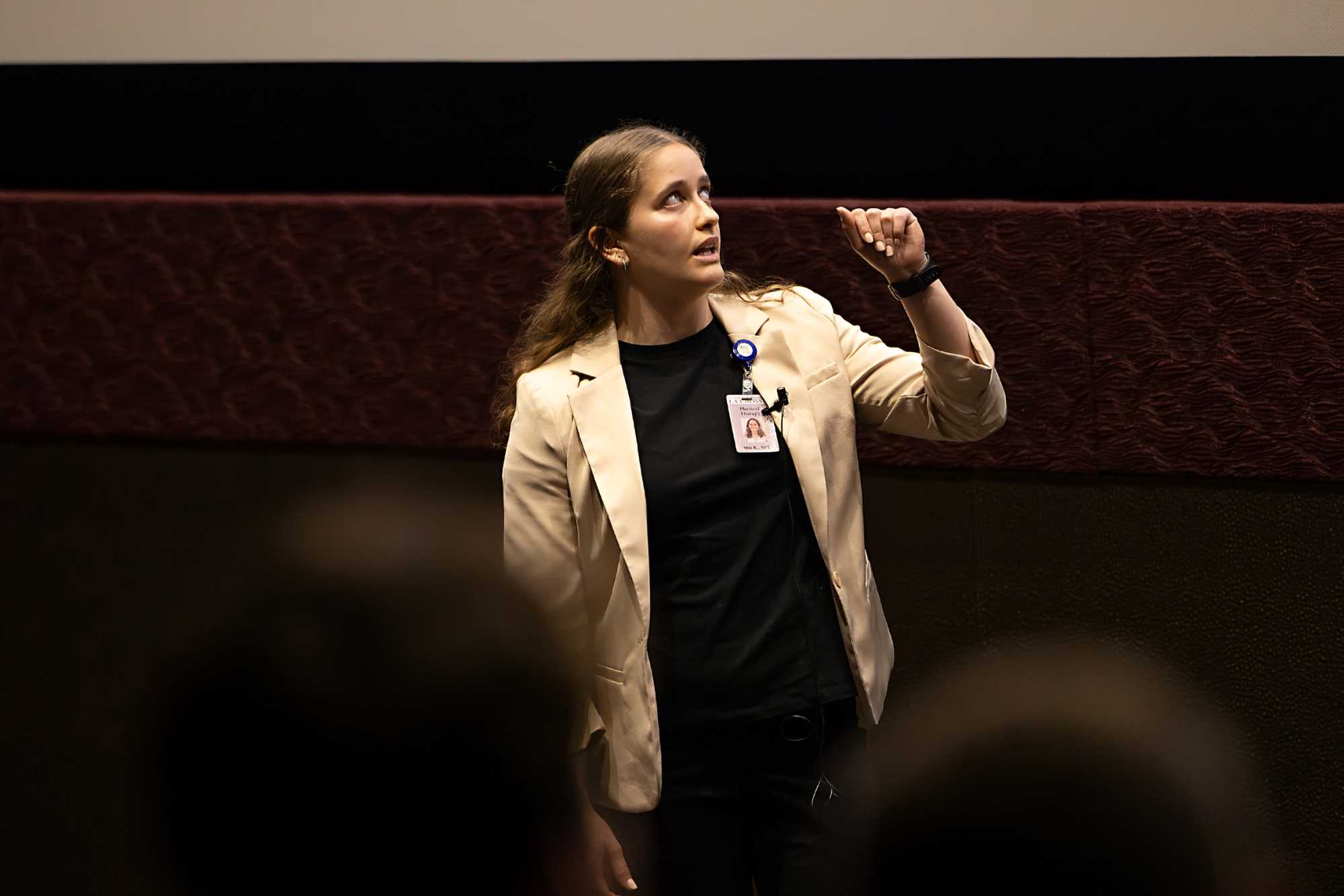 Mia Khalil, a graduate student studying physical therapy, discusses her research into wrestler nutrition plans during Graduate & Extended Learning's 3 Minute Grad Project event.
