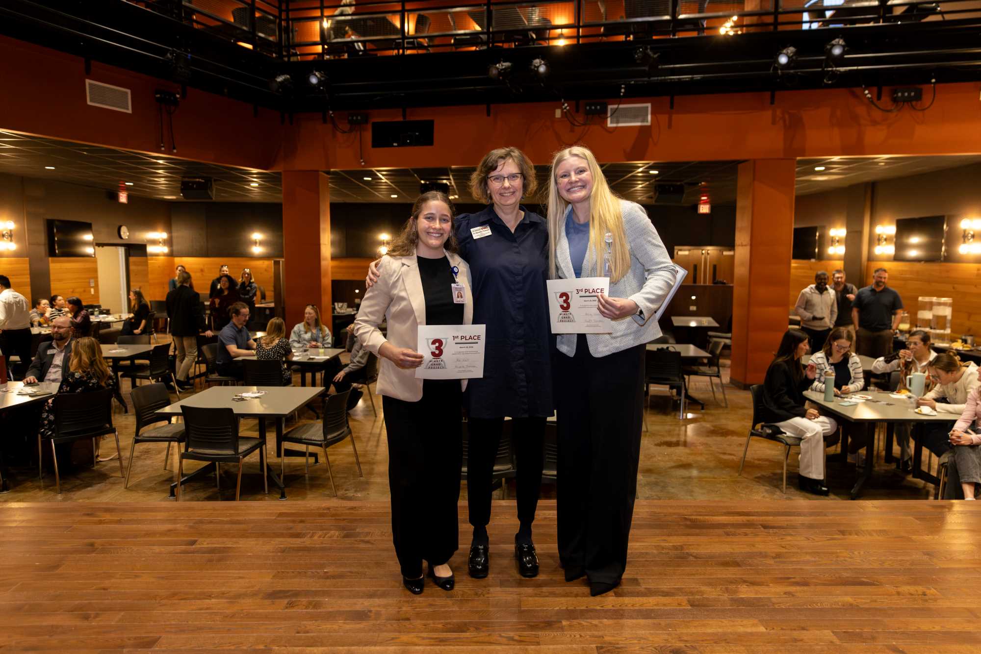 Meredith Thomsen, dean of Graduate & Extended Learning, congratulates Khalil (first place) and Ashley Hanson (third place) at the 3 Minute Grad Project reception.