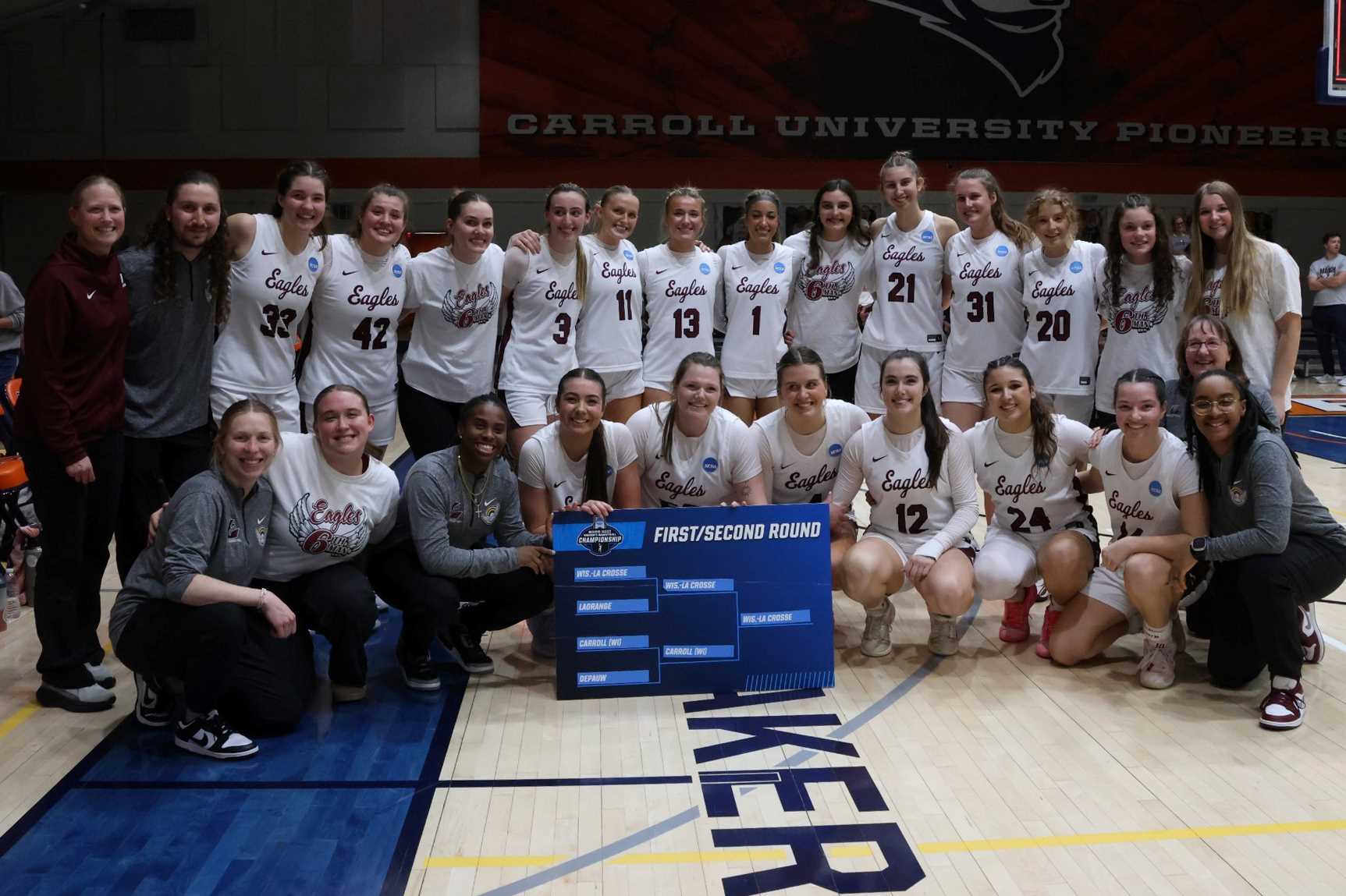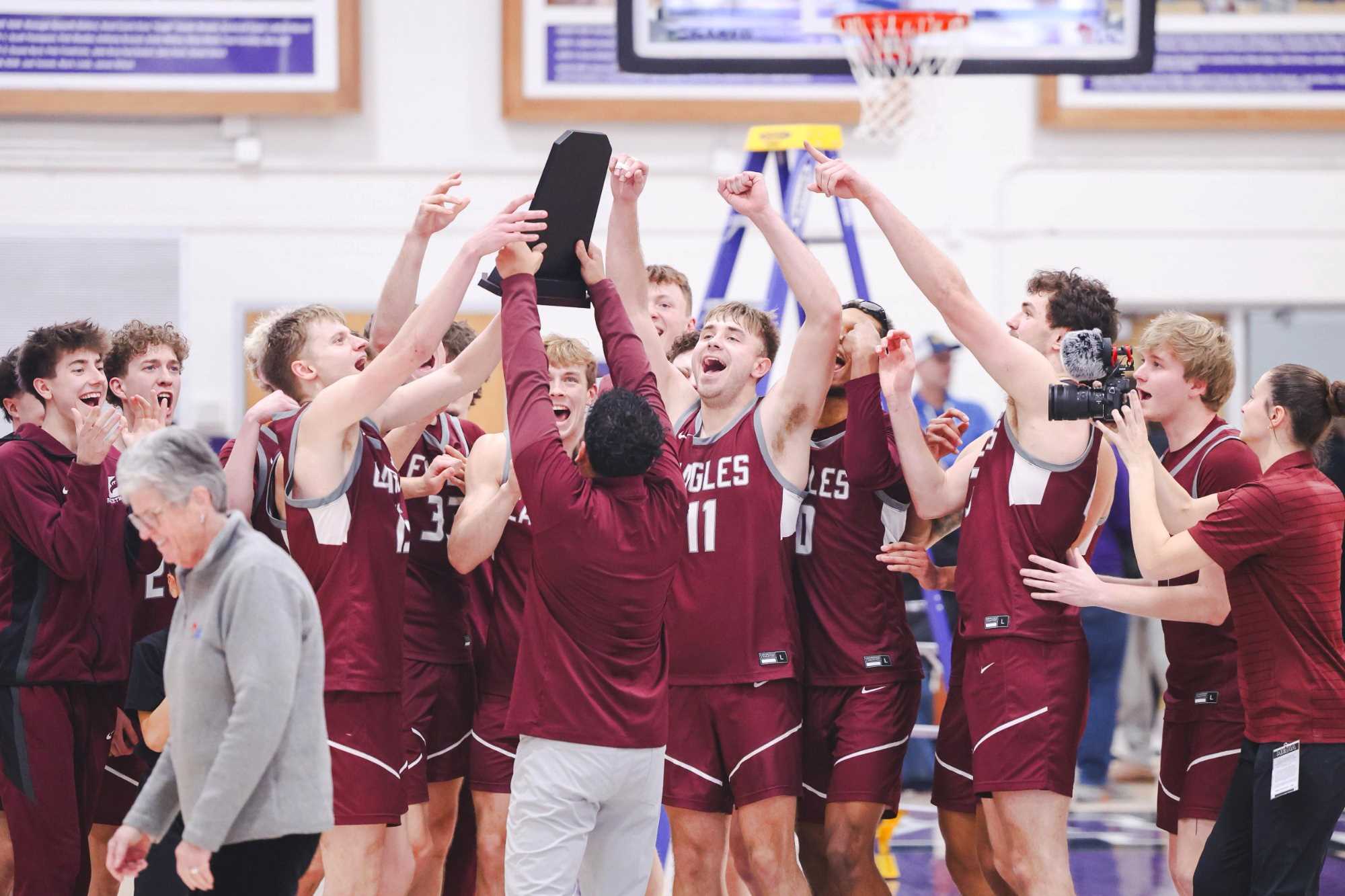 An elated men's basketball team celebrates after winning the Wisconsin Intercollegiate Athletic Conference tournament — the first conference tournament title in program history.