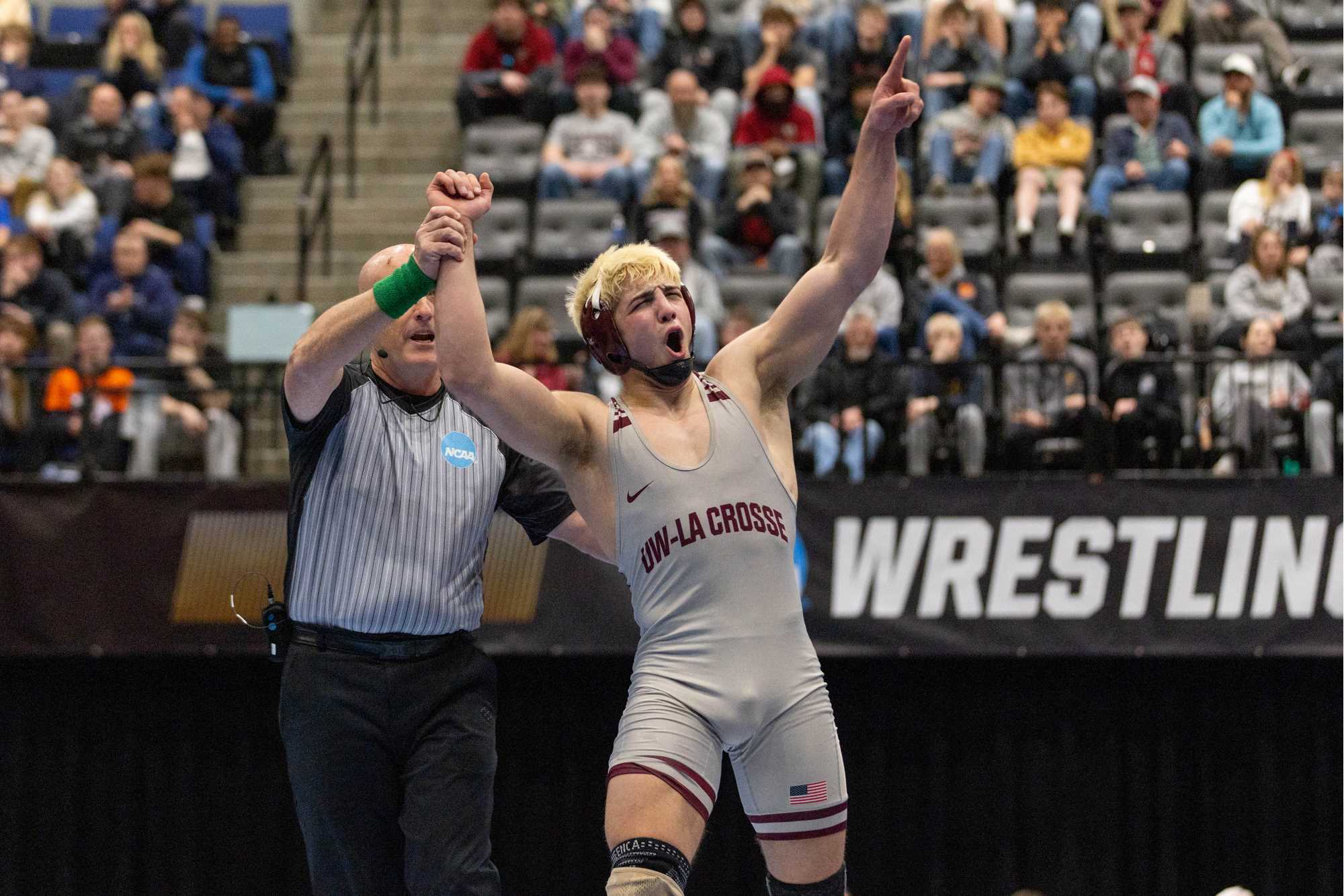 Tanner Gerber became the first wrestler in UWL history to win the 165-pound title at the NCAA Division III Championships. Photo by Keara Chaperon