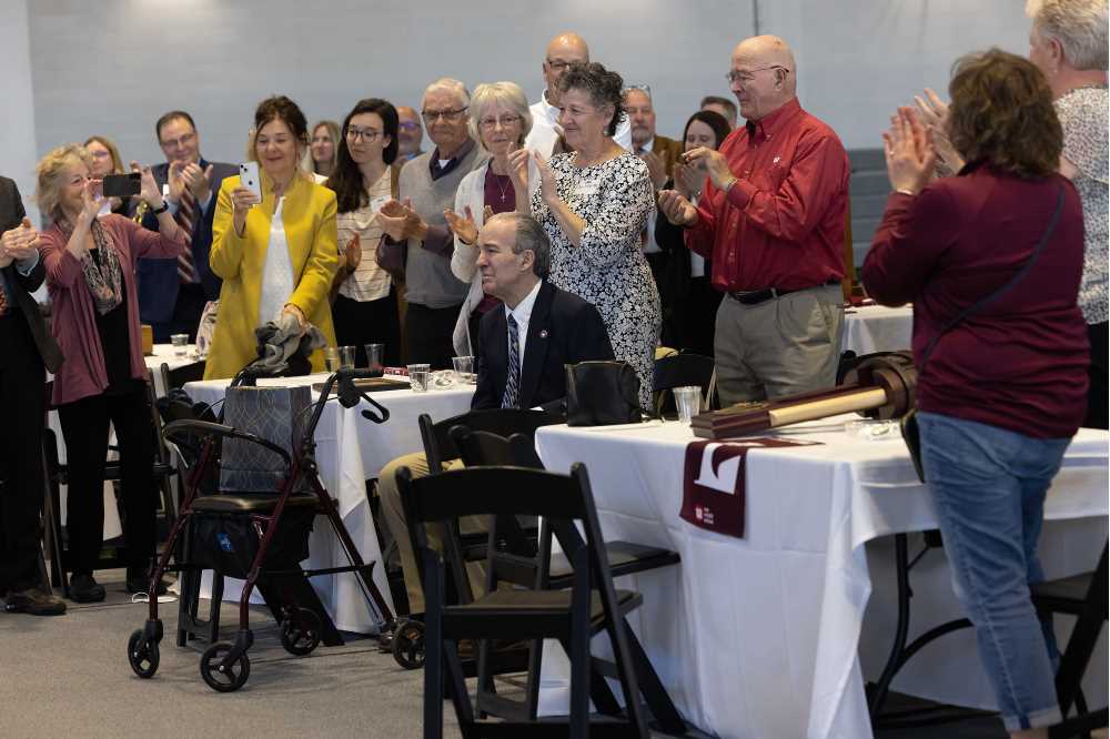 During a celebration at the end of April, it was announced that UWL's new Fieldhouse would be named for Bob Hetzel (seated), who is retiring after 17 years as vice chancellor for Administration & Finance.