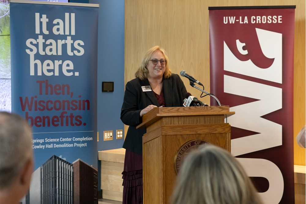 Interim Chancellor Betsy Morgan speaks to the campus community at a news conference announcing two major gifts in support of UWL's Microbiology Department and River Studies Center.