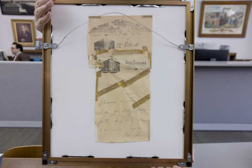 While campaigning for president, John F. Kennedy came to speak at the old Mary E. Sawyer Auditorium in downtown La Crosse. He stayed at the Hotel Stoddard, formerly located on Fourth Street. The back of this photo includes a handwritten note from Kennedy to the hotel's owner and manager, John Elliott.