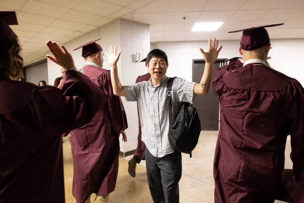 Eddie Kim, associate professor of mathematics, congratulates new graduates during commencement at the La Crosse Center.