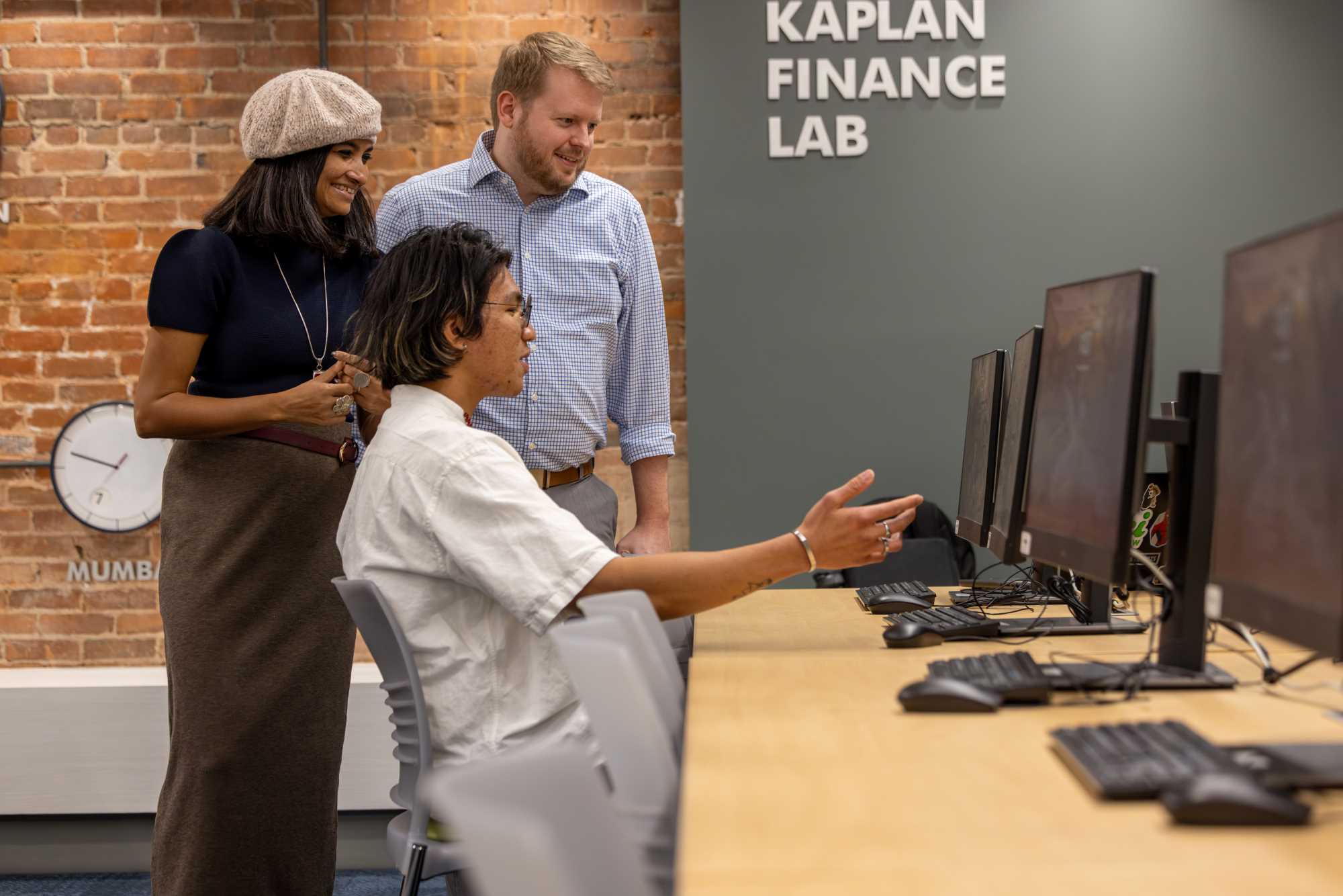 Kang Doung, an inaugural memeber of UWL's Undergraduate Research & Creativity Laureate Program, chats with his mentors, Adam Stivers and Nabamita Dutta.