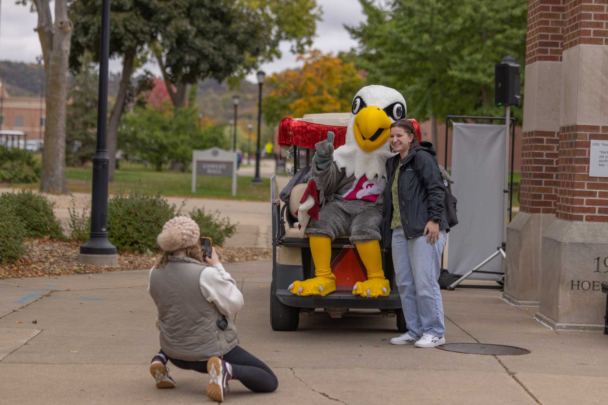 A student poses with Stryker before catching a ride on the Class Cab.