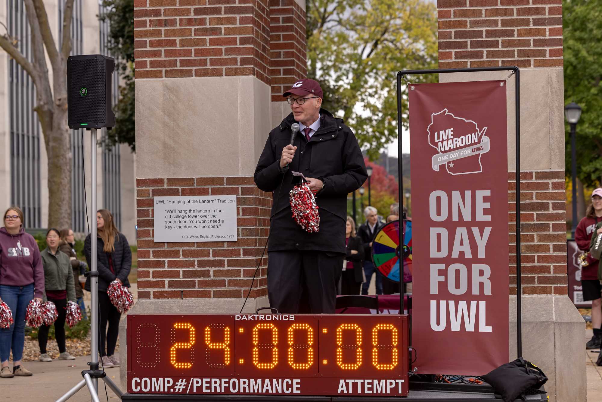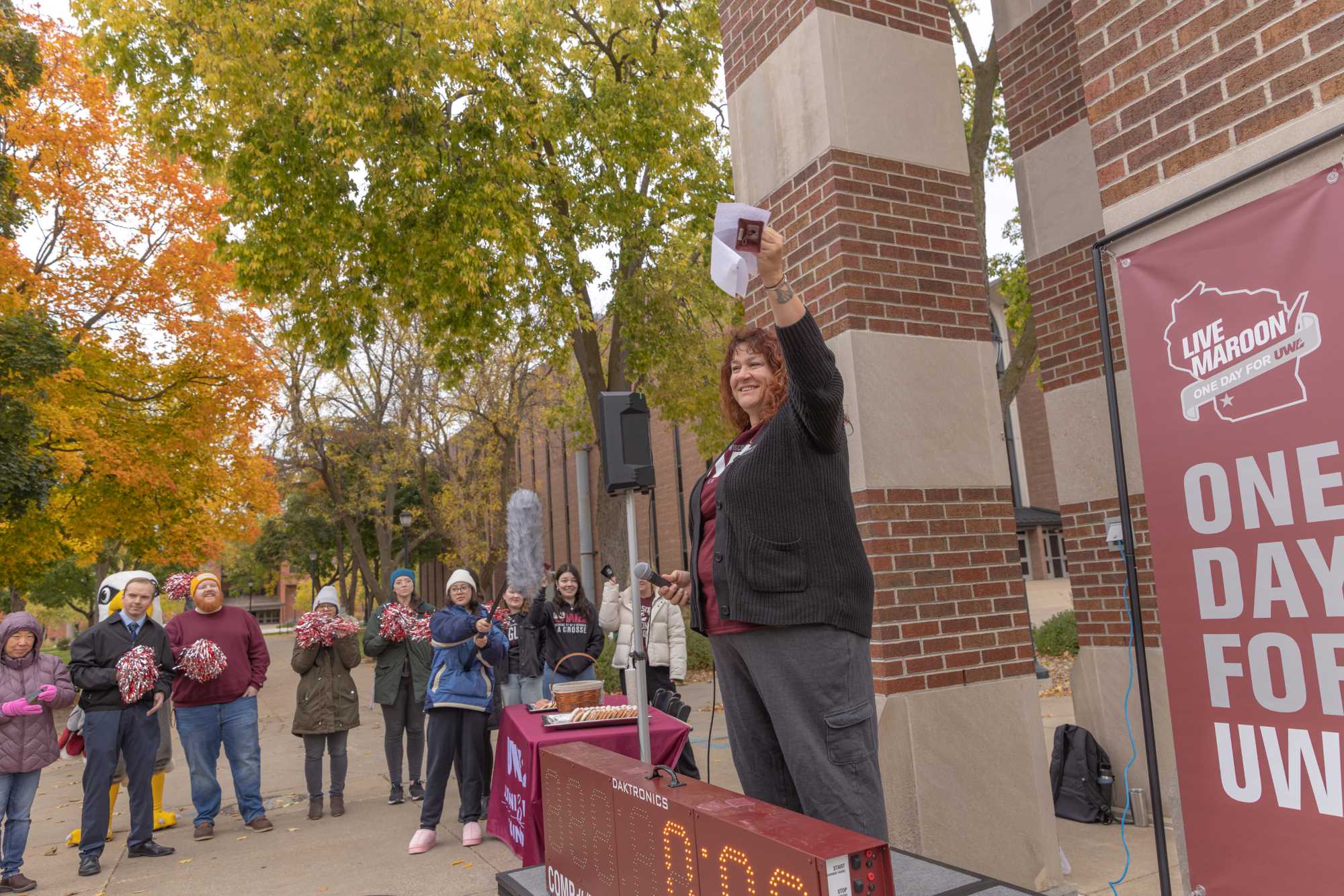 Chancellor Beeby helps "ring in" the sixth-annual One Day for UWL at Hoeschler Tower.
