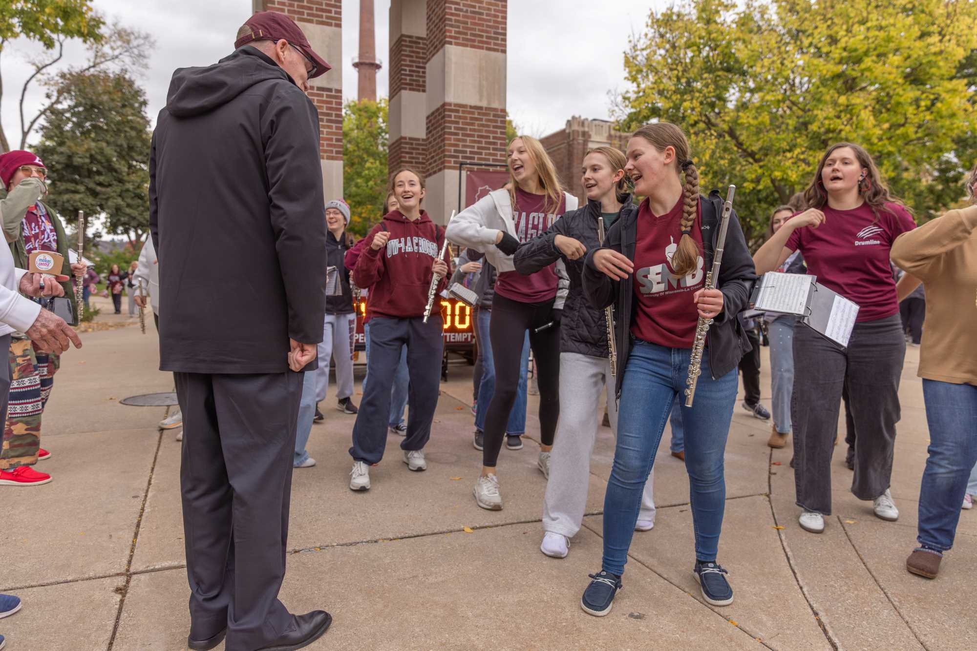 Members of the Screaming Eagles Marching Band serenade Chancellor Beeby with a rendition of Bruce Channel's "Hey, Baby (Beeby)" during One Day for UWL.