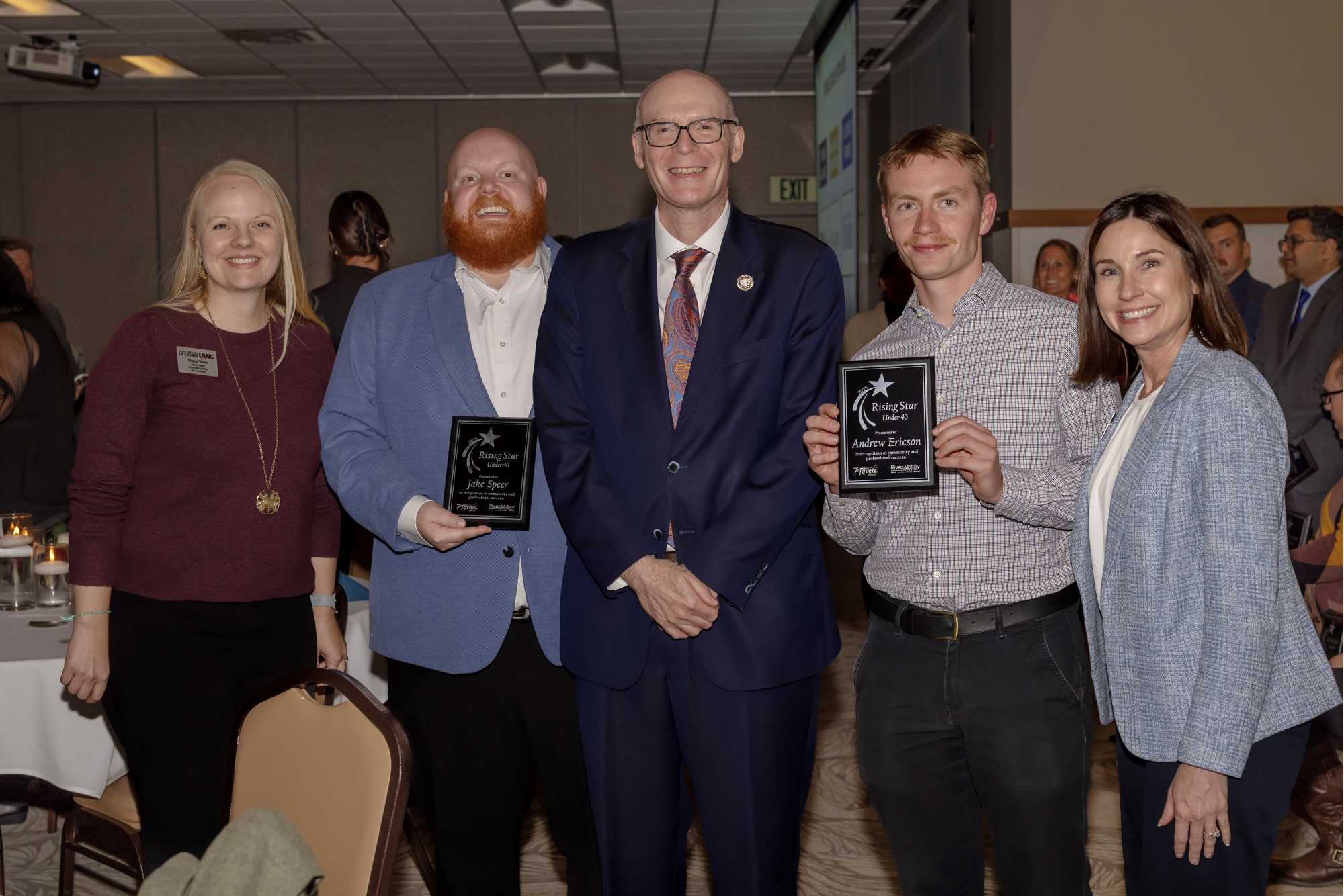 Leaders from UWL's Chancellor's Office celebrate with Jake Speer and Andrew Ericson after the pair were recognized as Rising Stars Under 40 by the 7 Rivers Alliance and River Valley Media Group.