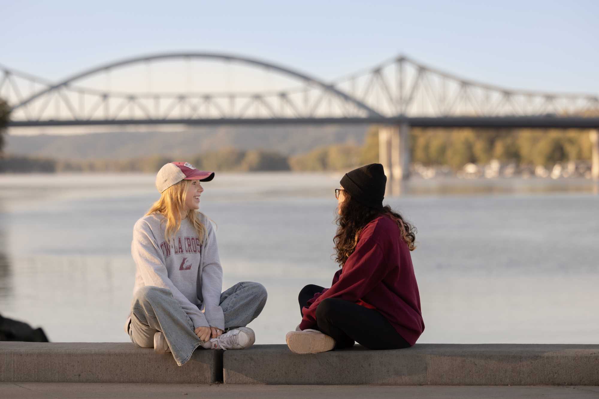 Two students enjoy a quiet morning at the levee in Riverside Park.