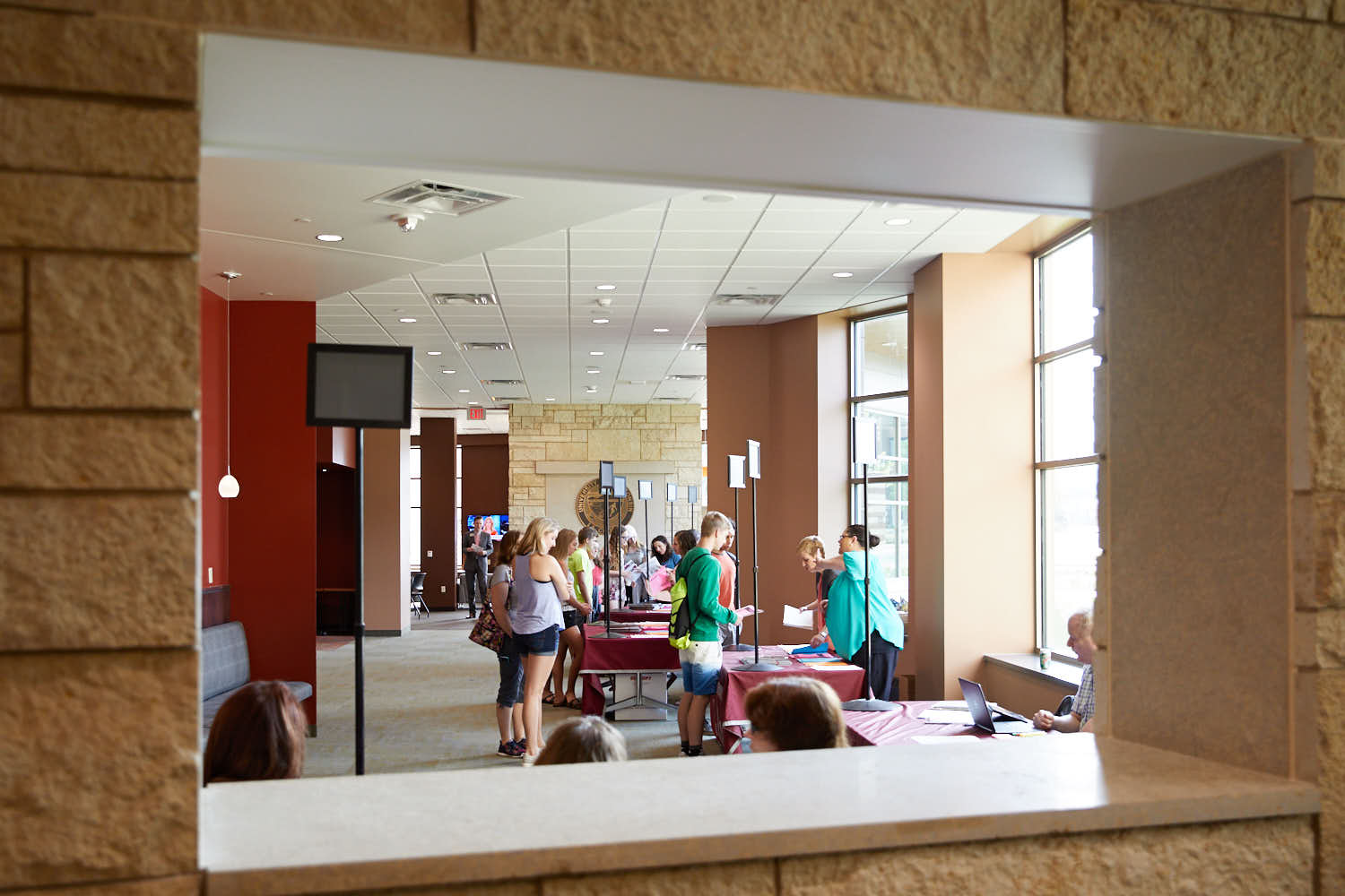 UWL staff setup information tables in the Student Union while parents and students check-in.[/caption]