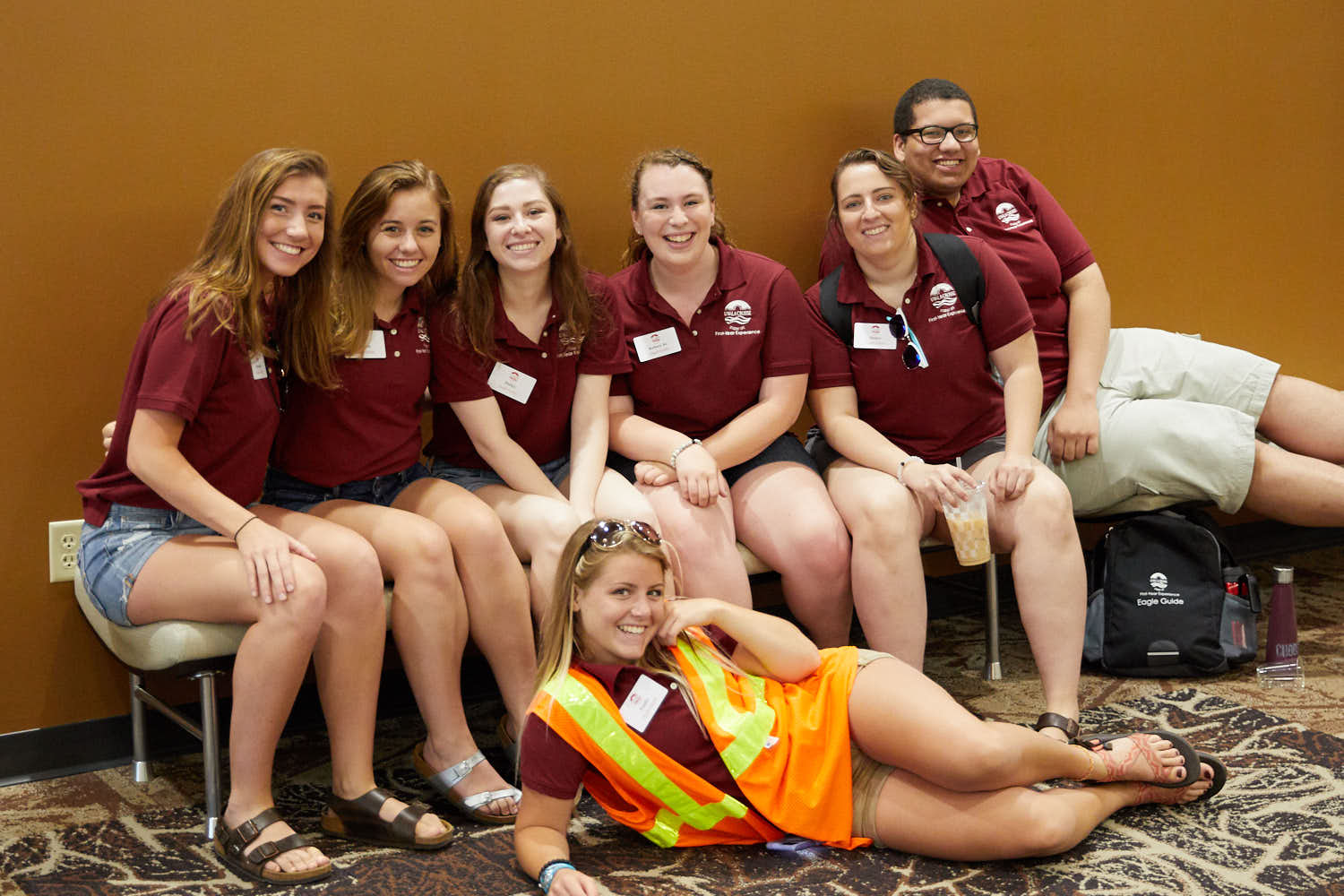 UWL Eagle Guides pose before leading students through campus during registration.[/caption]