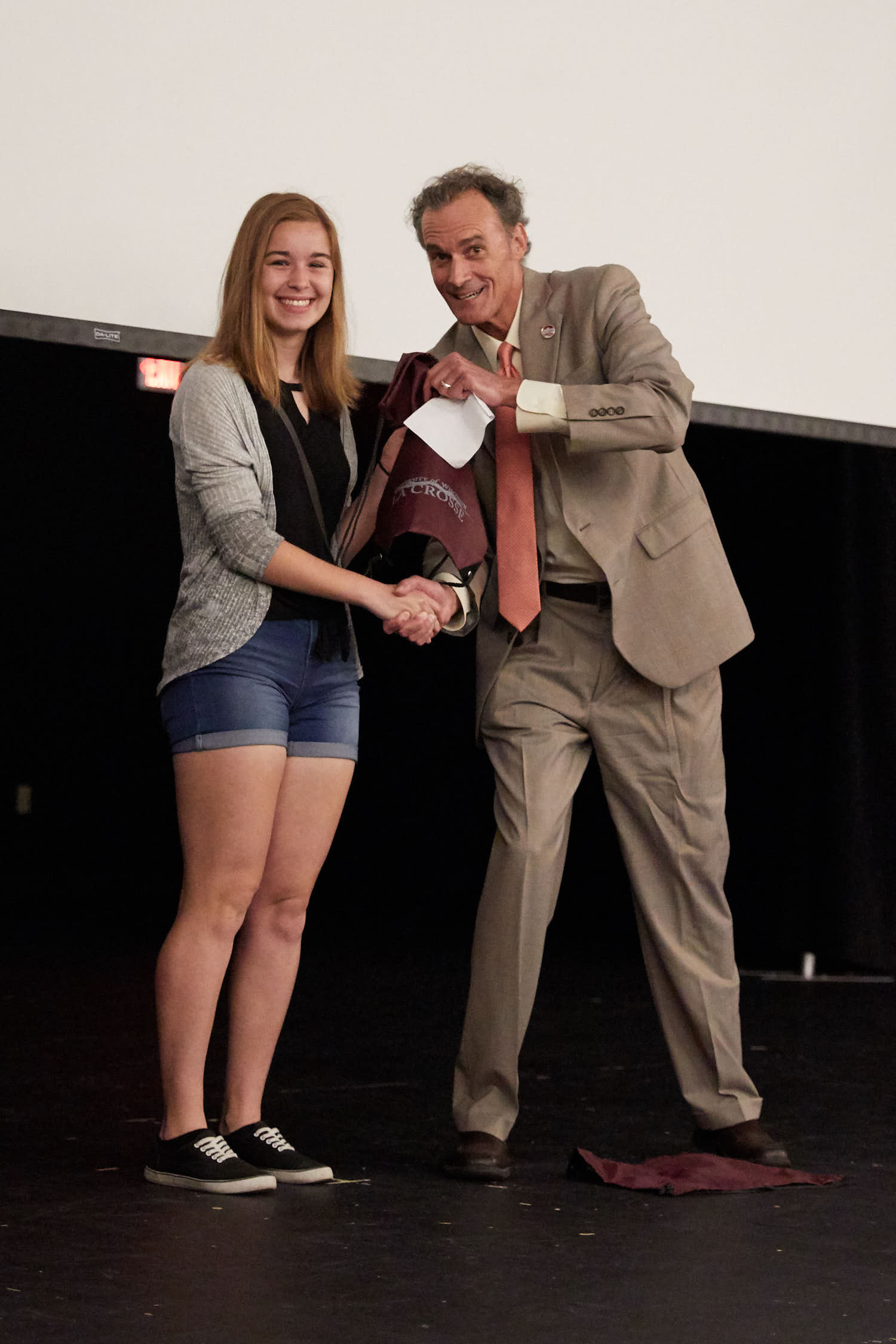 Ana Daun accepts an honorary diploma from Chancellor Joe Gow during a mock graduation ceremony at a general session in the Student Union. The short and witty ceremony gave students a glimpse into their future: when they walk across the stage to shake the Chancellor's hand during commencement.[/caption]