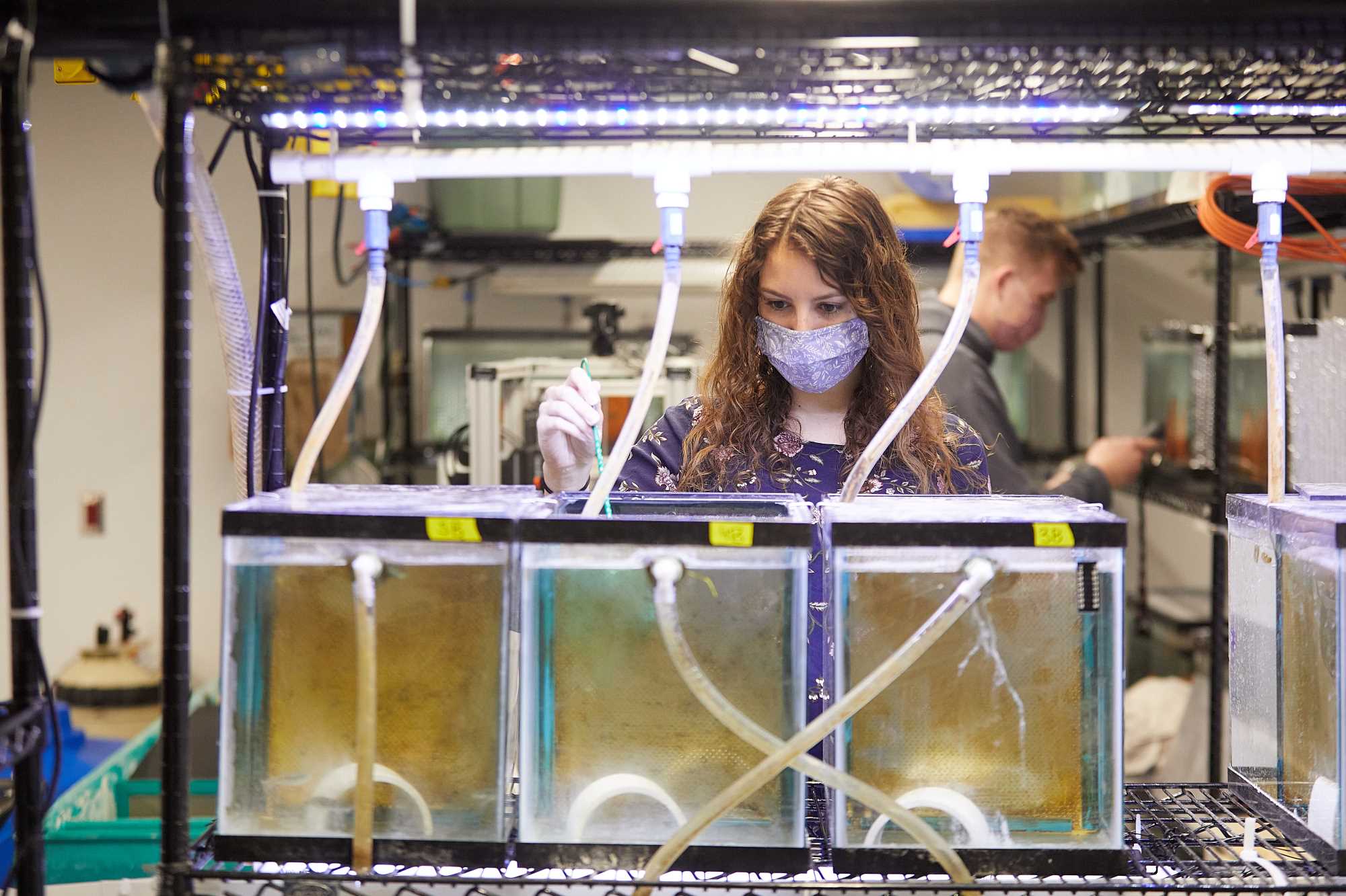 Student Shayla Michel checks on her fish tanks in the River Studies Lab in Prairie Springs Science Center.