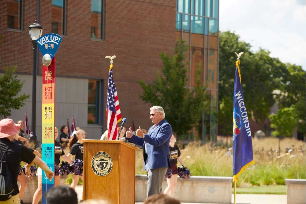 UW System Interim President Tommy Thompson addressed campus and student athletes during a Vax Up pep rally in August.