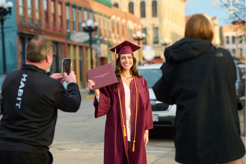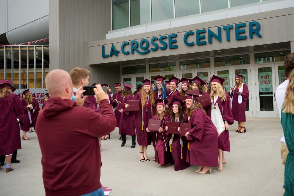 Students pose for a photo in front of the La Crosse Center. UWL hosted an in-person commencement ceremony for graduates only in May.
