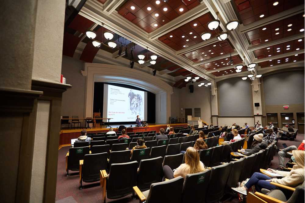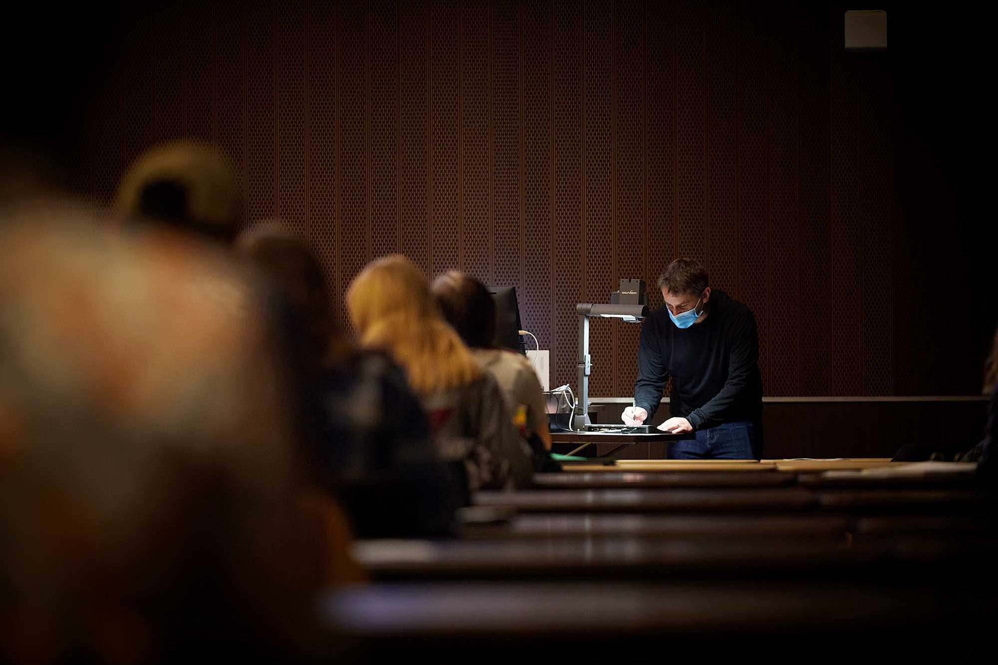 Aric Opdahl, Chemistry, leads a lecture in the Student Union.