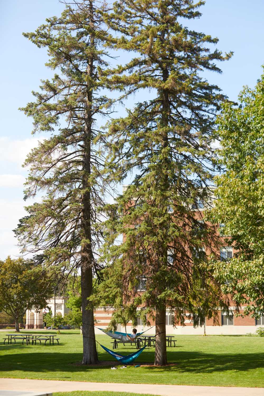 Students enjoy an early warm, spring day in March by hanging out in hammocks near Murphy Library.