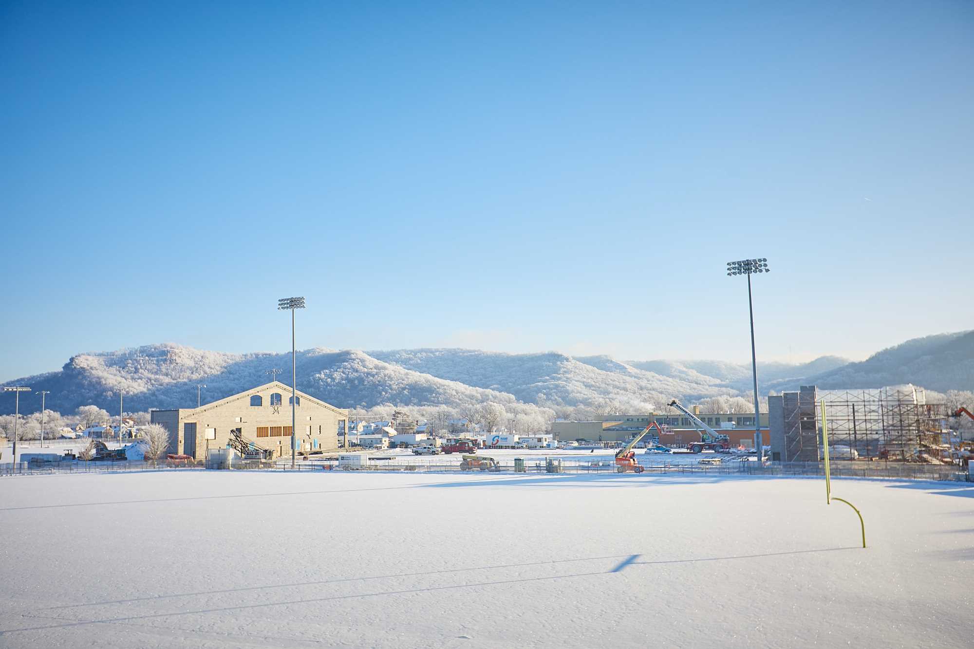 The Eagle L on the Roger Harring Stadium surrounded by frosty tree limbs.