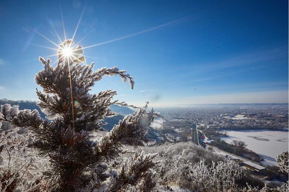 Rime frost coats a cedar on top of Miller Bluff looking over the city.
