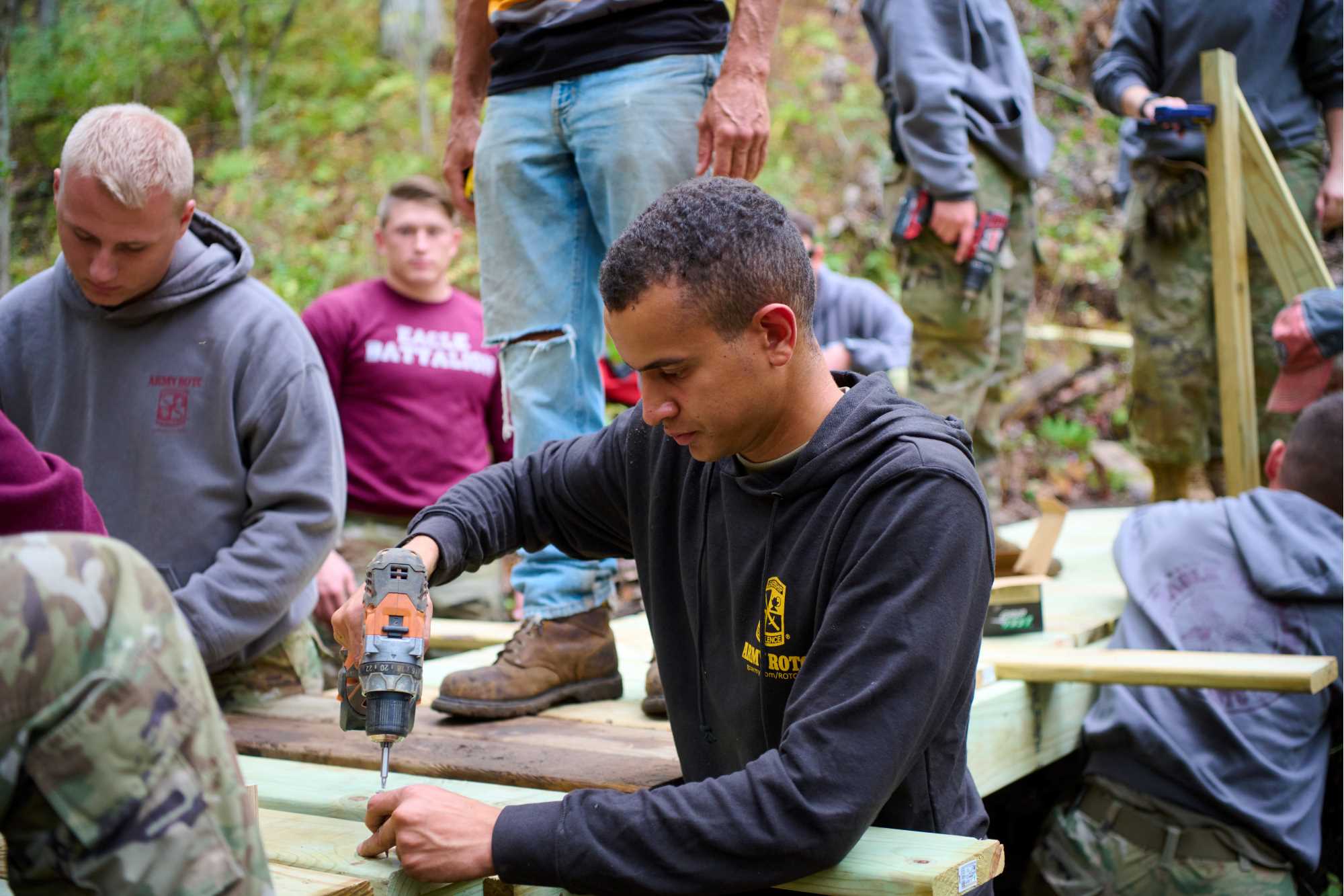 The ROTC Eagles Battalion rebuild bridges in Hixon Forest.