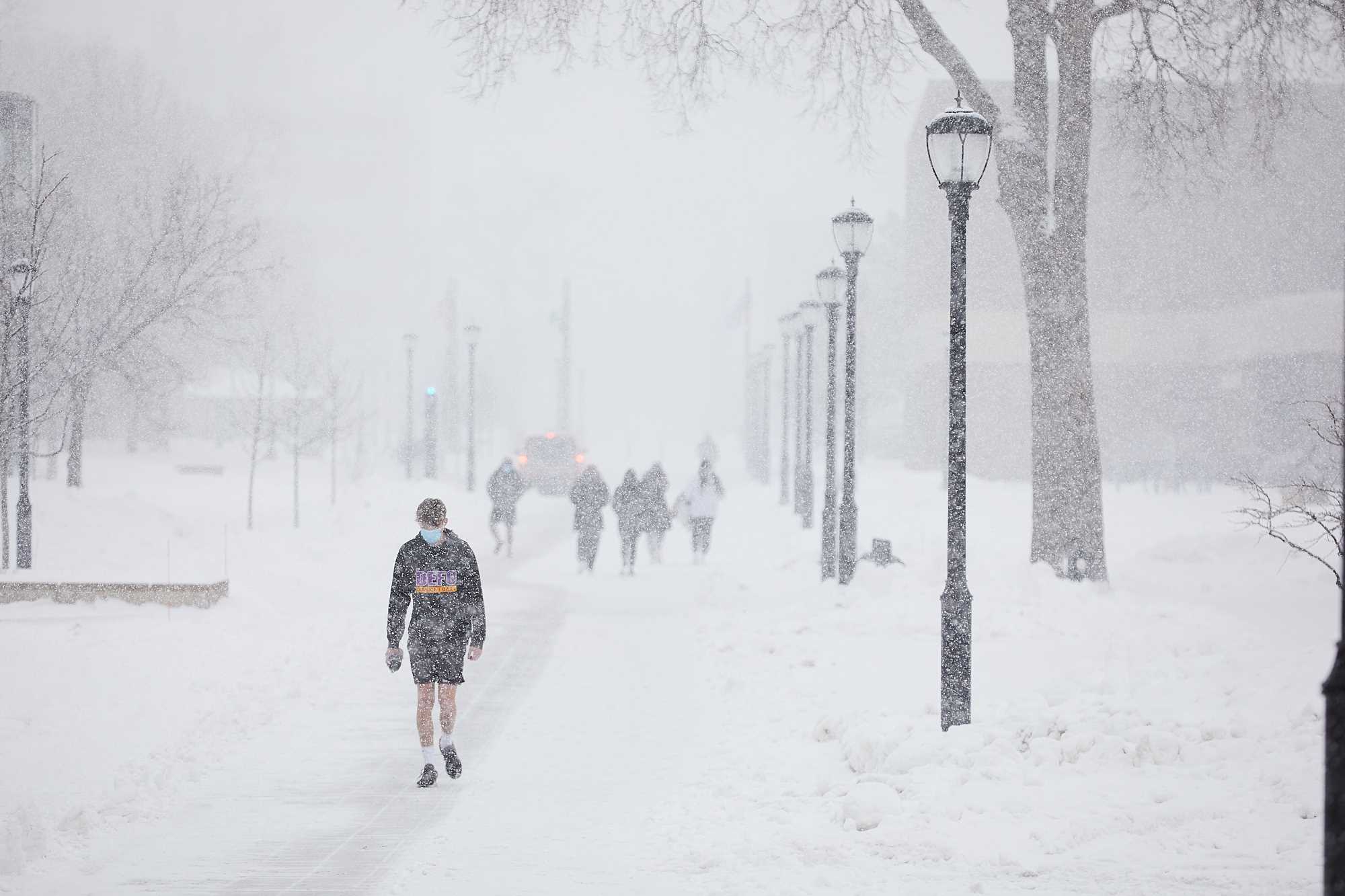 Shorts weather? A student walks down Badger Street in shorts during a February snowstorm.