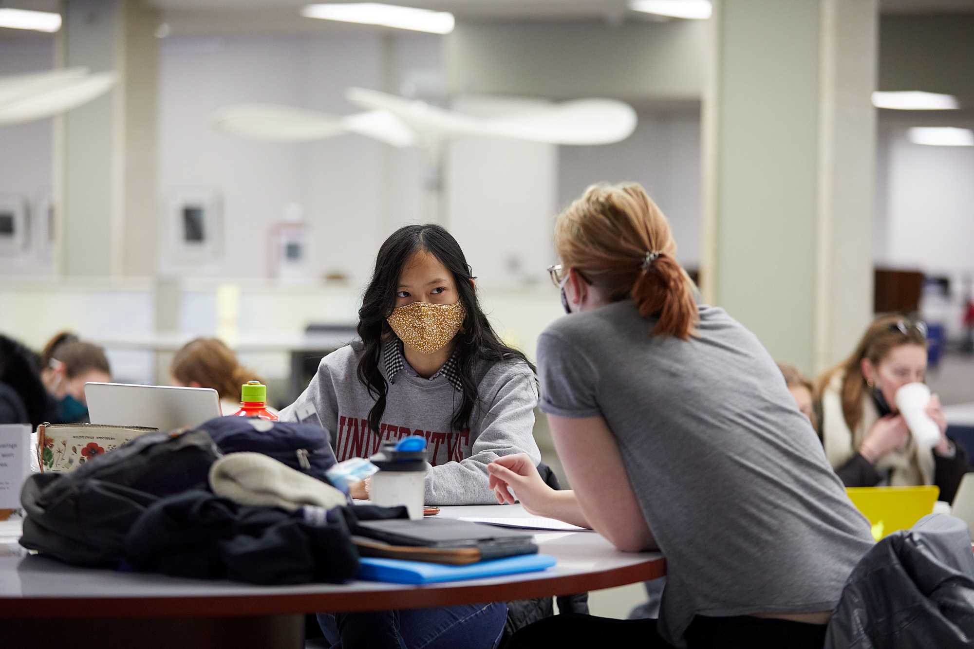 Students practice speaking foreign languages with a partner at Language Resource Center in Graff Main Hall.