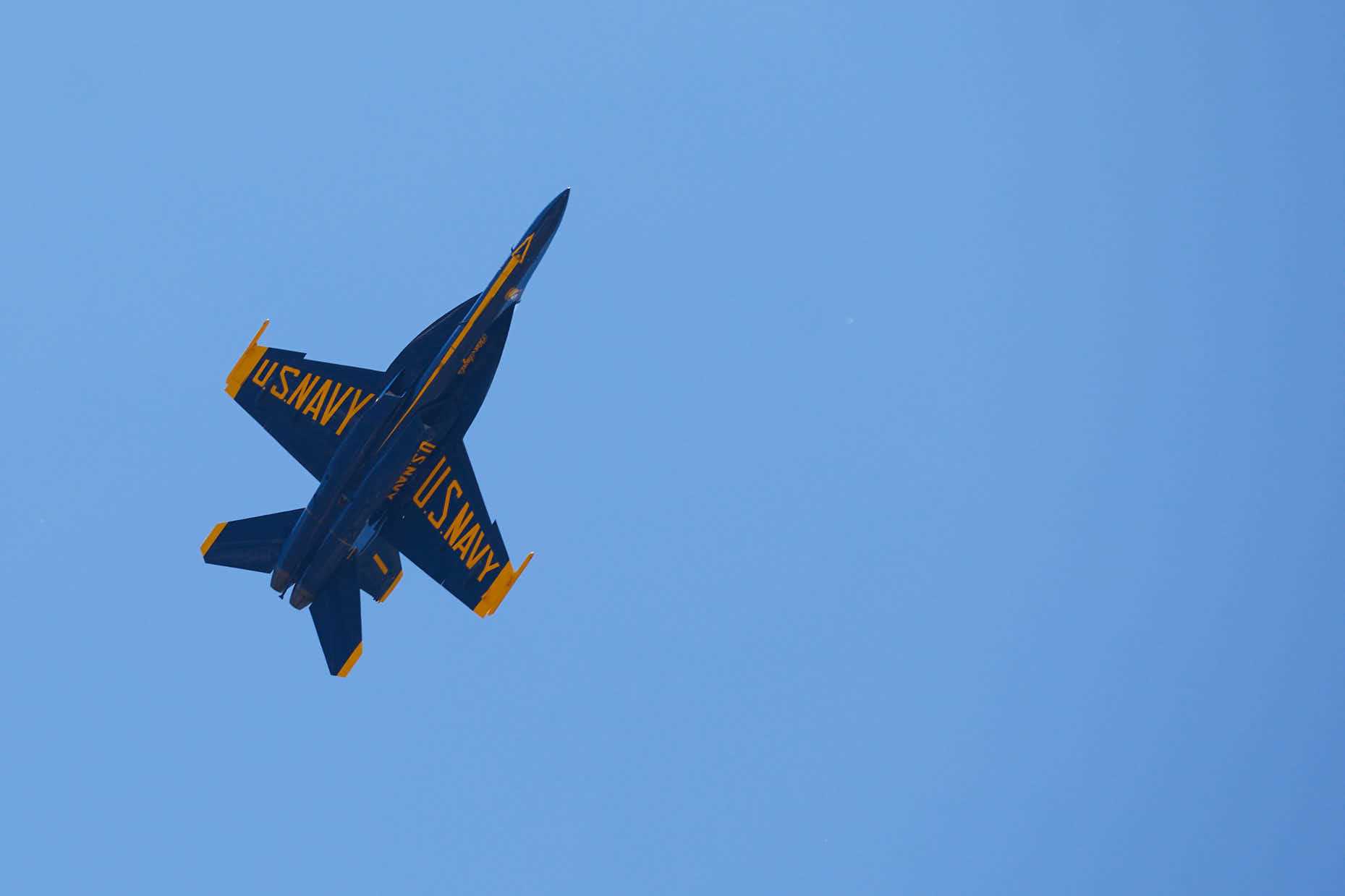 A U.S. Navy Blue Angel jet flies over campus. The Blue Angels were in the area for the Deke Slayton Airfest in June.