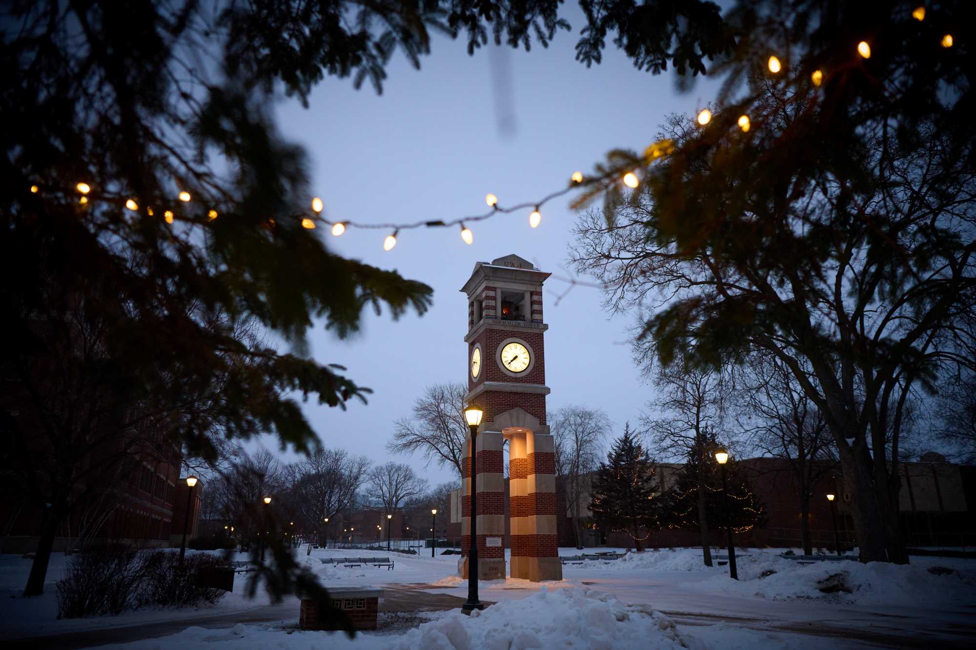 Trees around Hoeschler Tower are adorned with holiday lights.
