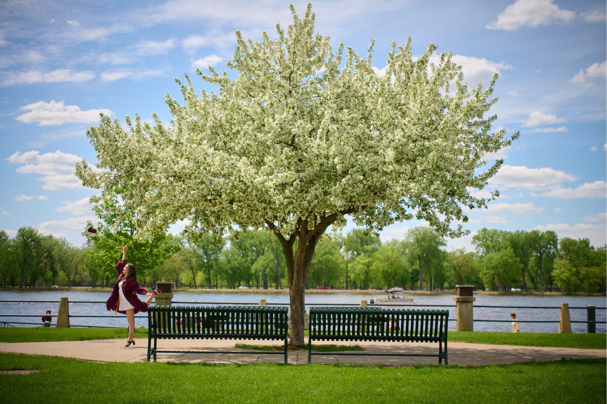 A graduate poses by a flowering crabapple tree in Riverside Park.