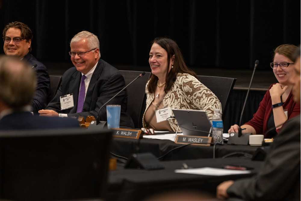 From left, Quinn Williams, UW System General Counsel; Jay Rothman, president of the UW System; Karen Walsh, regent president; and Megan Wasley, interim executive director and corporate secretary for the board, during the UW System Board of Regents meeting.