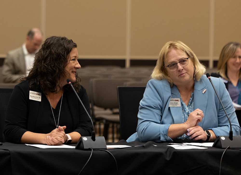 From left, Melissa Weege, UWL Radiation Therapy program director, and UWL Provost Betsy Morgan speak during a UWL host campus presentation “Imagine-ing Radiological Science Undergraduate Health Profession Careers” during the Education Committee meeting Thursday, July 6.