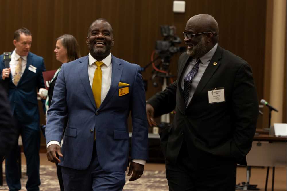 From left, Andrew P. Daire, the provost and vice chancellor for Academic Affairs at UW-Milwaukee, walks with Corey A. King, chancellor of UW–Whitewater. The meeting brings together provosts, chancellors, UW System staff, UW System Board of Regents members and many other professionals from across the UW System.