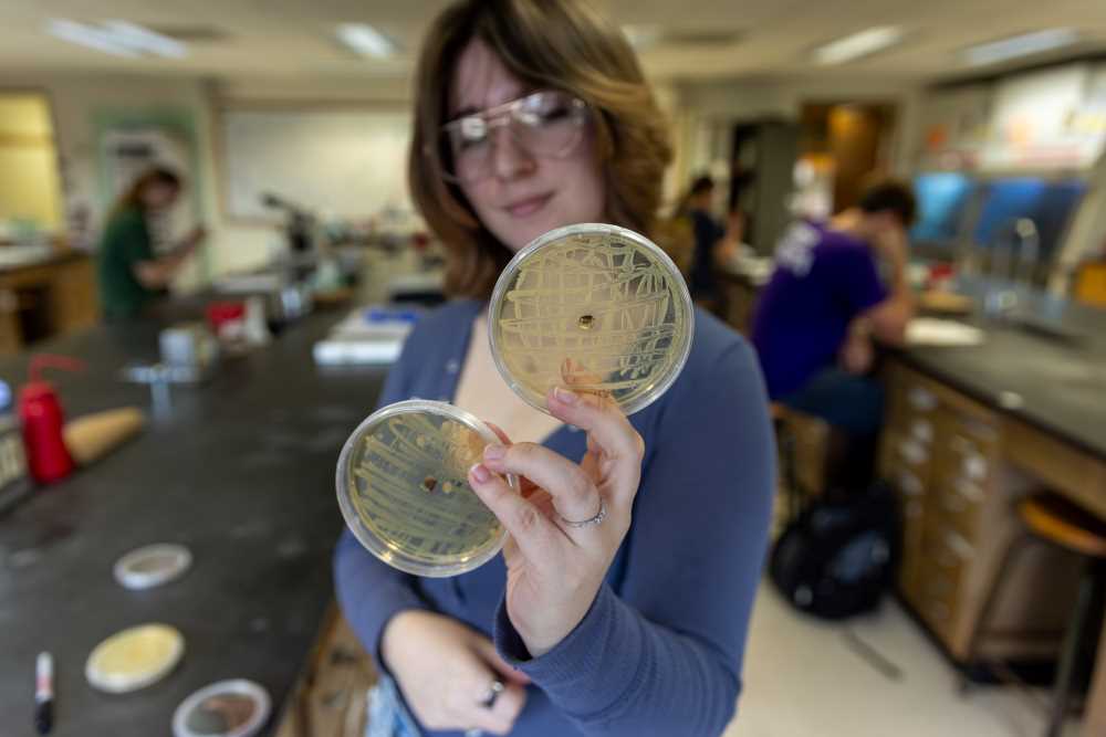 A UWL medical mycology students holds up a petri dish where she is experimenting with fungi in hopes of identifying antibacterial and antifungal properties.